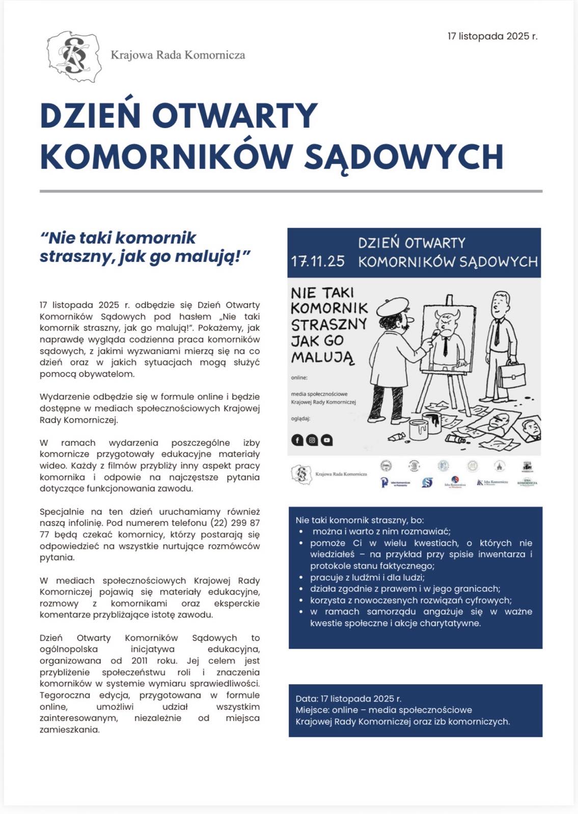 Infolinia Krajowej Rady Komorniczej Ruszyła Infolinia Krajowej Rady Komorniczej! Każdy, kto chciałby zasięgnąć informacji odnośnie egzekucji komorniczej może je uzyskać. Infolinia czynna będzie w każdy wtorek w godz. 9-15 pod numerem (22) 299 87 77.